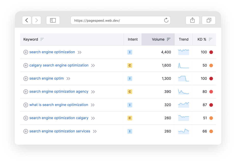 With each keyword or keyphrase that we look at, we identify two important metrics: keyword difficulty and search volume. These numbers tell us how much competition there is for a search term and how many people (on average per month) are actually searching for it. We’ll look for terms that have low difficulty and high search volume – filtering down until we’re left with those with the greatest potential for your business.