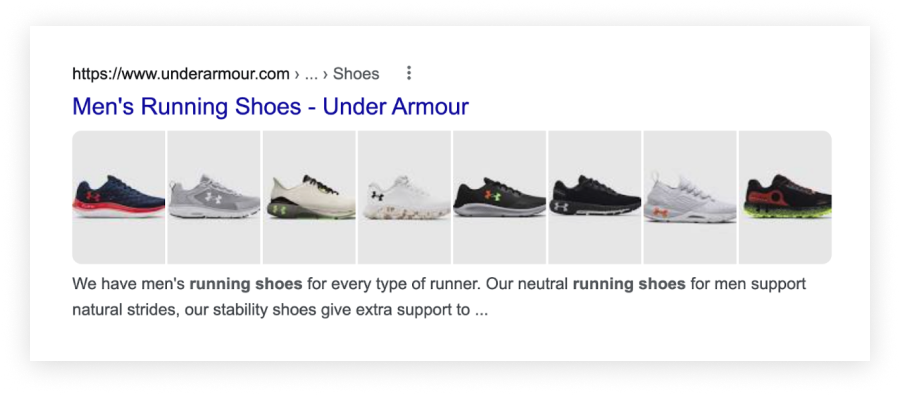 Showing results for Running Shoes, Google not only links to the Under Armour website, but starts to pull products in dynamic image extensions. Since these products are well-optimized, each image is linked to a product page, allowing users to shop right from the SERP.