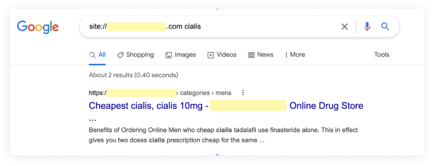 To check that a website hasn’t already been hacked, we’ll do a search of all the indexed pages in Google, and make sure that they’re all supposed to be there. Here’s an example of compromised content in a past client’s website.