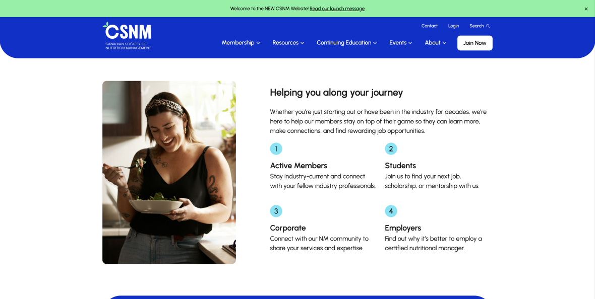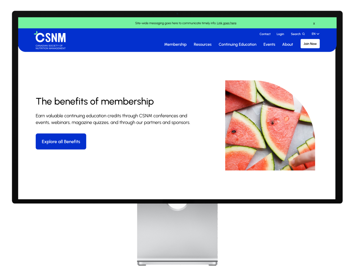 CSNM strives to be modern, professional, exciting, inclusive and dynamic. Before starting the website, we elevated the CSNM brand to mirror these desired brand personality traits and help position the organization as an inspiring leader in the Canadian nutrition space. The newly designed logo, accessible typography, refreshed palette and graphics work together to establish a look and feel that captures CSNM’s vibrant community and the passion of the profession.