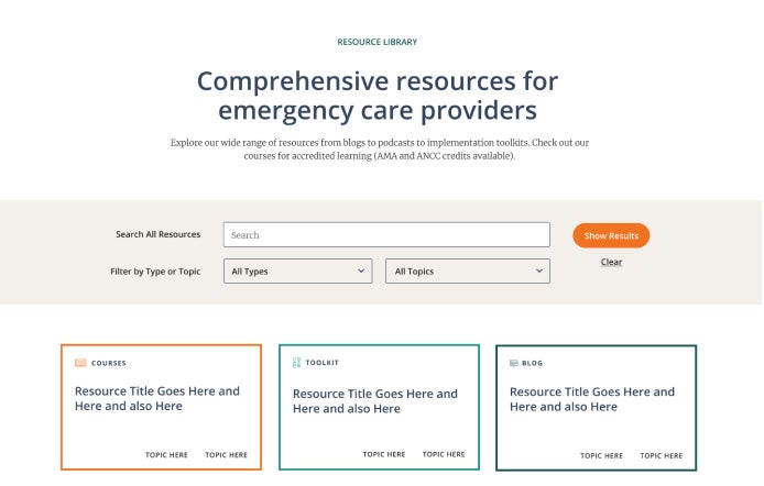 Emergency Department professionals are required to take courses throughout the year to earn credits as part of their continuing medical education (CME). The resource hub includes a custom course portal, which shows currently assigned courses, courses in progress, completed courses, and legacy certificates completed on the previous website’s course platform. It also allows users to generate printable certificates for newly completed courses. What’s more, we developed custom functionality for account admins to assign relevant course content to sub-users and monitor their progress. Users can also access organization-specific content such as documents, webinars, and toolkits.